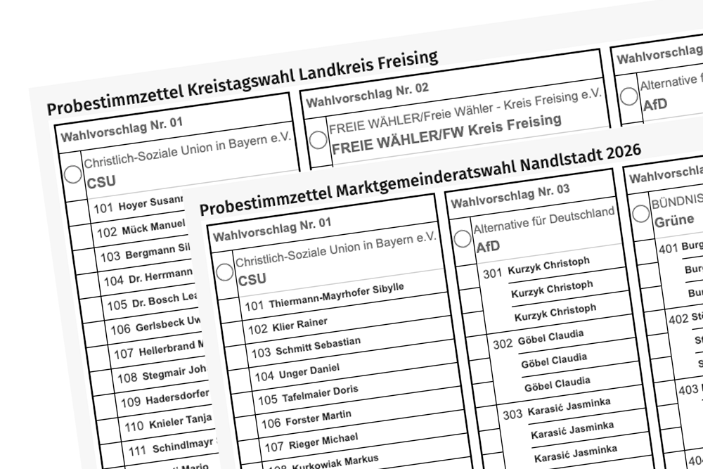 Zur Vorbereitung auf die Kommunalwahl 2026 stellen wir Ihnen die interaktiven Probestimmzettel für die Marktgemeinderatswahl in Nandlstadt sowie für die Kreistagswahl im Landkreis Freising bereit. So können Sie sich vorab in Ruhe mit den Stimmzetteln vertraut machen und Ihre Wahl gut vorbereiten.